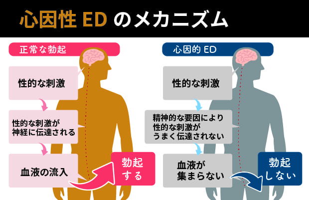 勃起に対するプレッシャーや、性行為に対する不安が原因となって勃起不全を引き起こします。